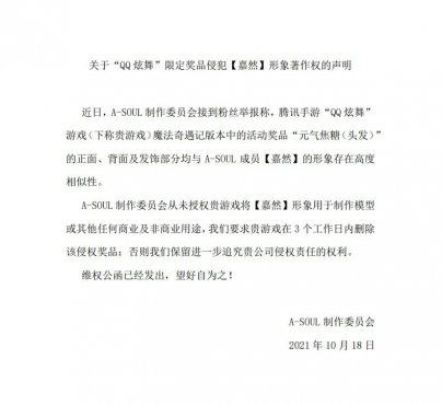 公告中,A-SOUL方面表示近日接到粉丝举报,《QQ炫舞》中的活动奖品“元气焦糖(头发)”的正面背面以及发饰均与A-SOUL成员嘉然的形象存在高度相似。ASOUL并未授权《QQ游戏》使用嘉然形象,要求《QQ炫舞》在3个工作日内删除该侵权奖品。