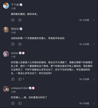 有00后的玩家,从小学的时候就躲在被窝里偷着玩《时空猎人》,用的还是天宇的小黄蜂手机,渐渐的游戏里的好友都不怎么玩了,上线之后一片灰色;也有人玩的第一款手游就是《时空猎人》,还是偷拿妈妈的手机玩的;还有人回忆起打赢跨服赛的快乐,那时候我们公会老大非常有责任心,而且很有经验,带我们打赢了比赛,当时把我开心坏了,虽然只是一个游戏,但是那种开心是让我至今难忘的。
